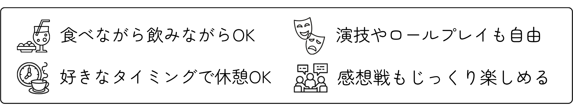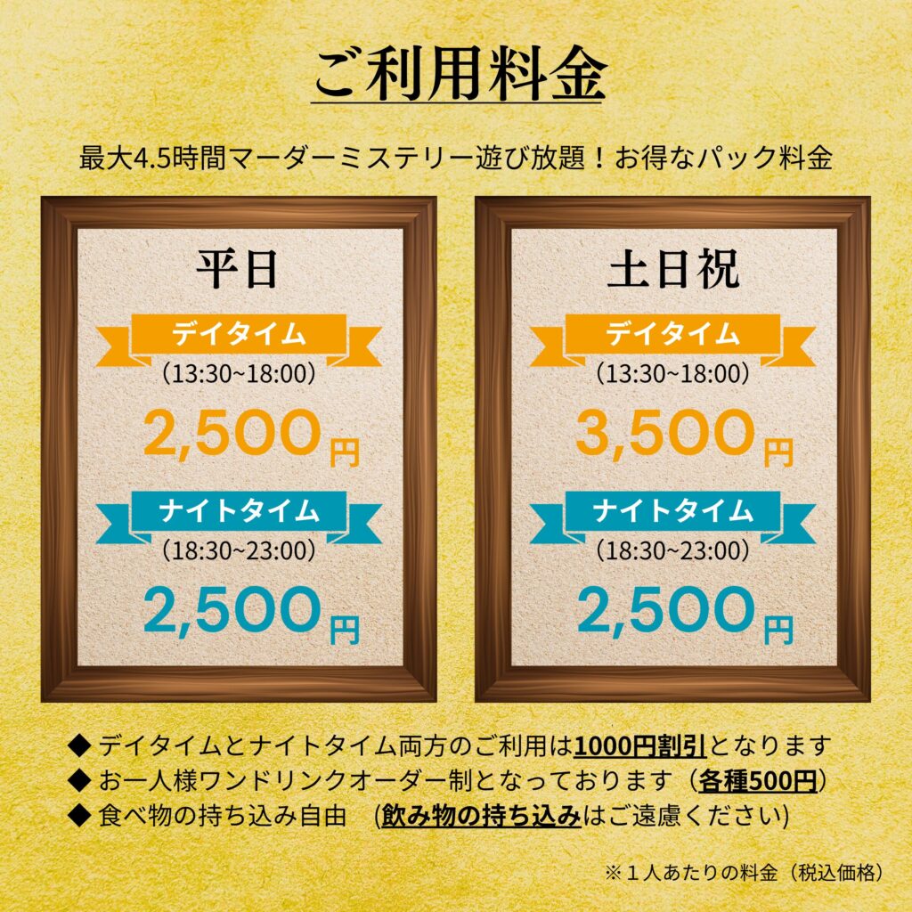 | その他 | ・マーダーミステリーやボードゲームの持ち込み自由 ・食べ物(匂いのキツくないもの)の持ち込み自由 ※ドリンクの持ち込みはご遠慮ください ・途中入退出自由 ・Wi-Fi・電源の利用可能 ・全席禁煙 ・利用人数3名〜 |